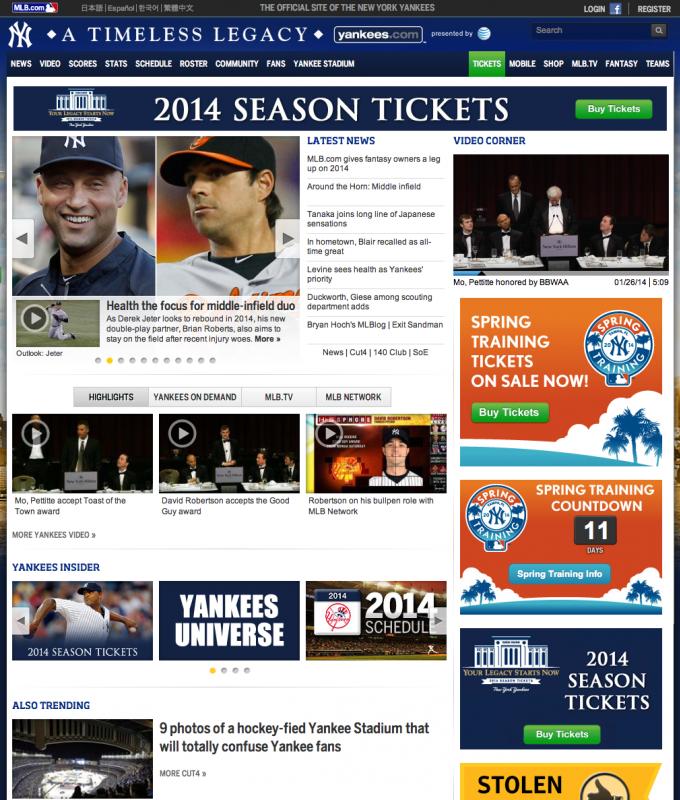 The Yankees website leaves a lot to be desired. It’s really surprising that such a big brand can have such a poor architecture of information. Visually and functionality wise, the website’s poorly curated structure seen here on the homepage and inconsistent use of typography lets the website down.